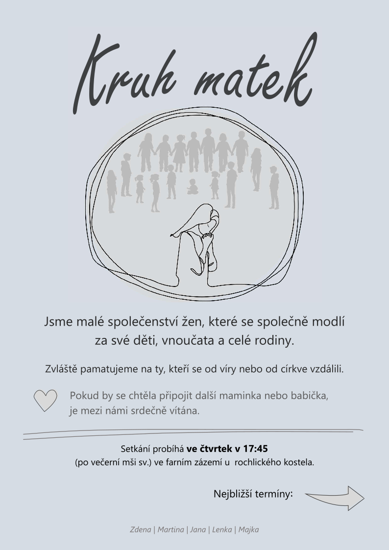Zvláště chceme pamatovat na ty, kteří se od víry nebo církve vzdálili. Inspirovala nás různá modlitební společenství matek, ale Kruh matek je volné setkávání maminek a babiček naší farnosti.